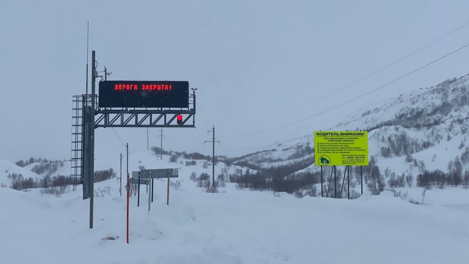 Дорога открыта с 10.30 для одностороннего движения от 32 км в сторону села Териберка и посёлка Туманный для проезда организованной группы транспортных средств.