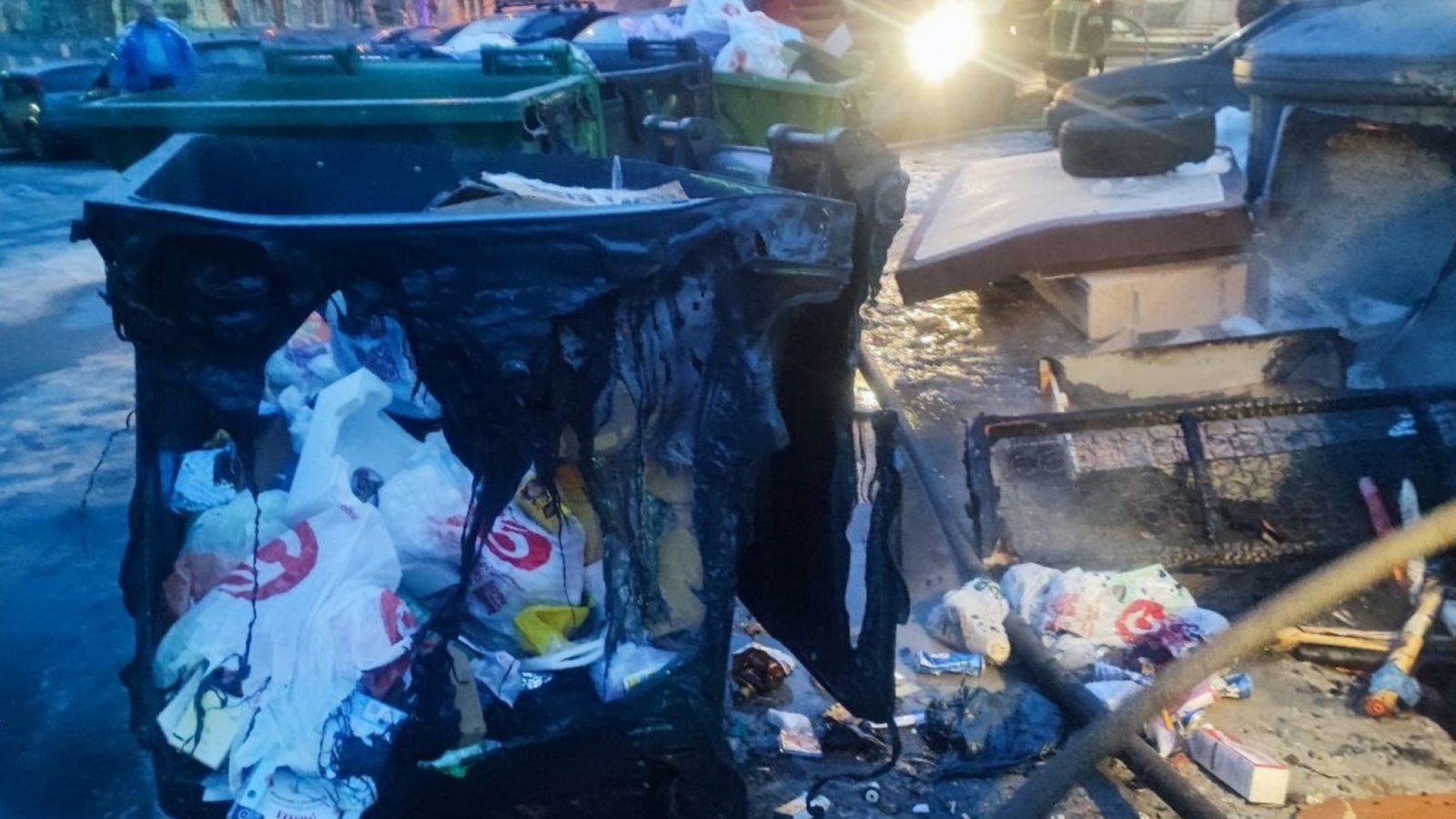 В 15.57 возгорание, в результате которого один пластиковый мусорный контейнер уничтожен огнём, а второй повреждён на площади 0,5 кв. м, полностью ликвидировано.