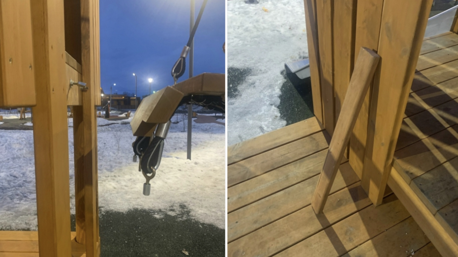На игровых элементах откручены болты на веревочных перилах мостика, валяются оторванные от ограждений комплекса доски.