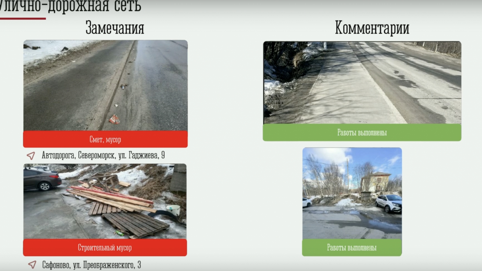 Критике, в частности, подверглось состояние улицы Преображенского, 3 в поселке Сафоново и улицы Гаджиева, 9 в Североморске.