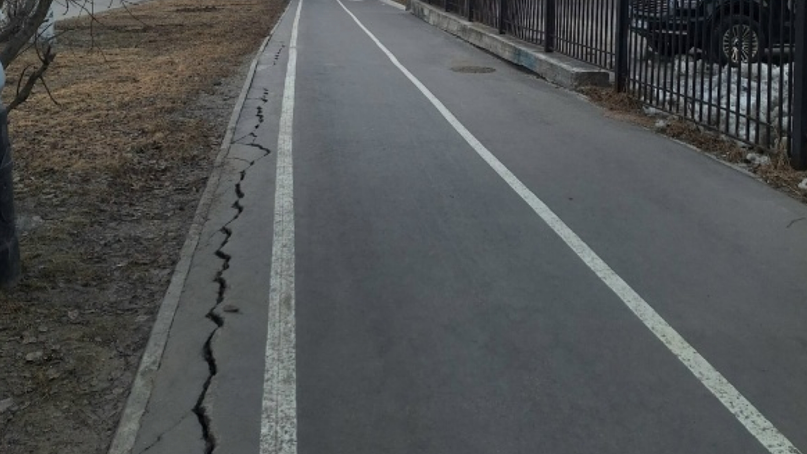 Трещина идёт по краю прохода вдоль газона.