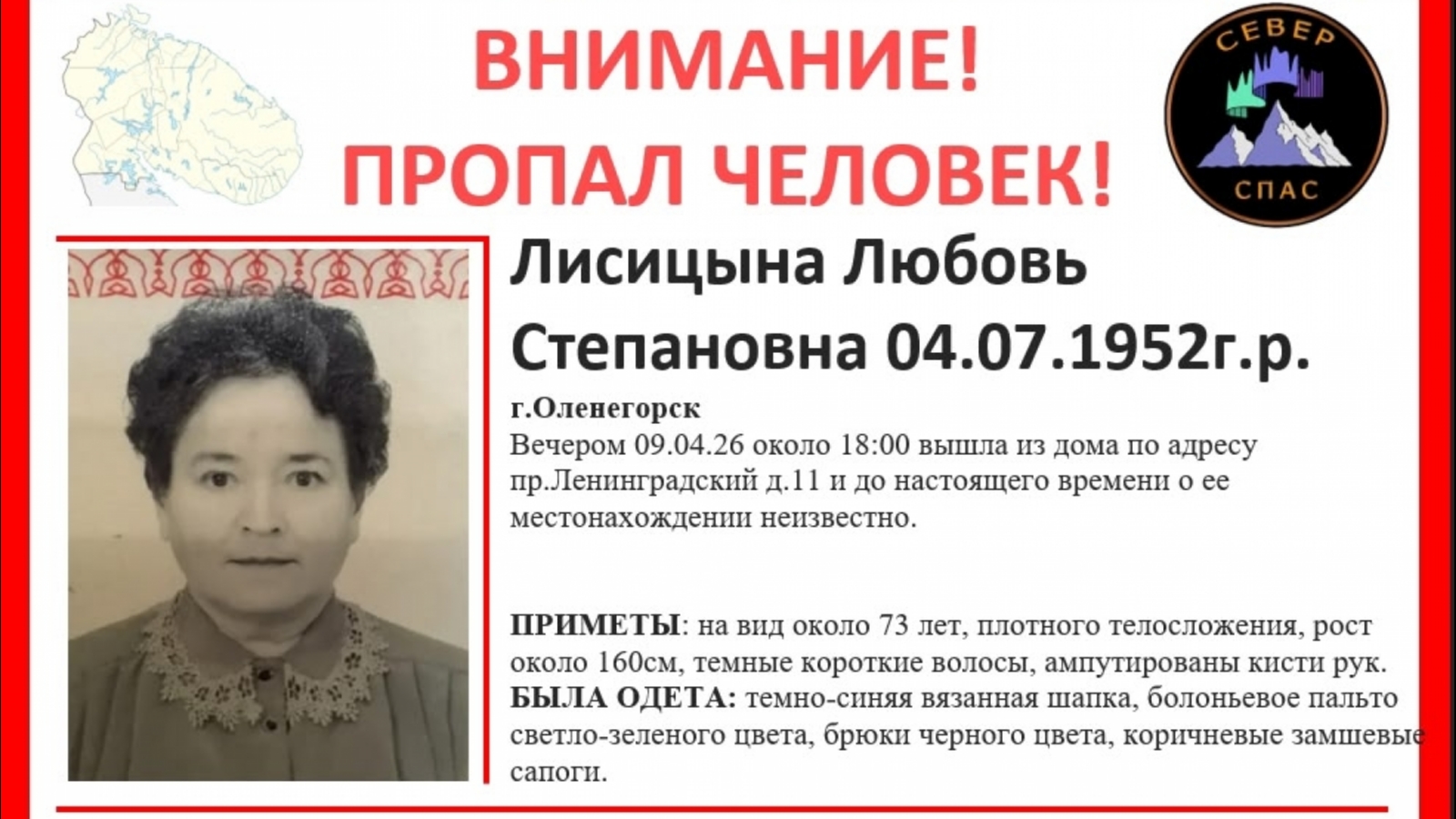 В Оленегорске пропала 74-летняя Любовь Лисицына. Она ушла из дома 9 апреля около 18.00 и пропала.