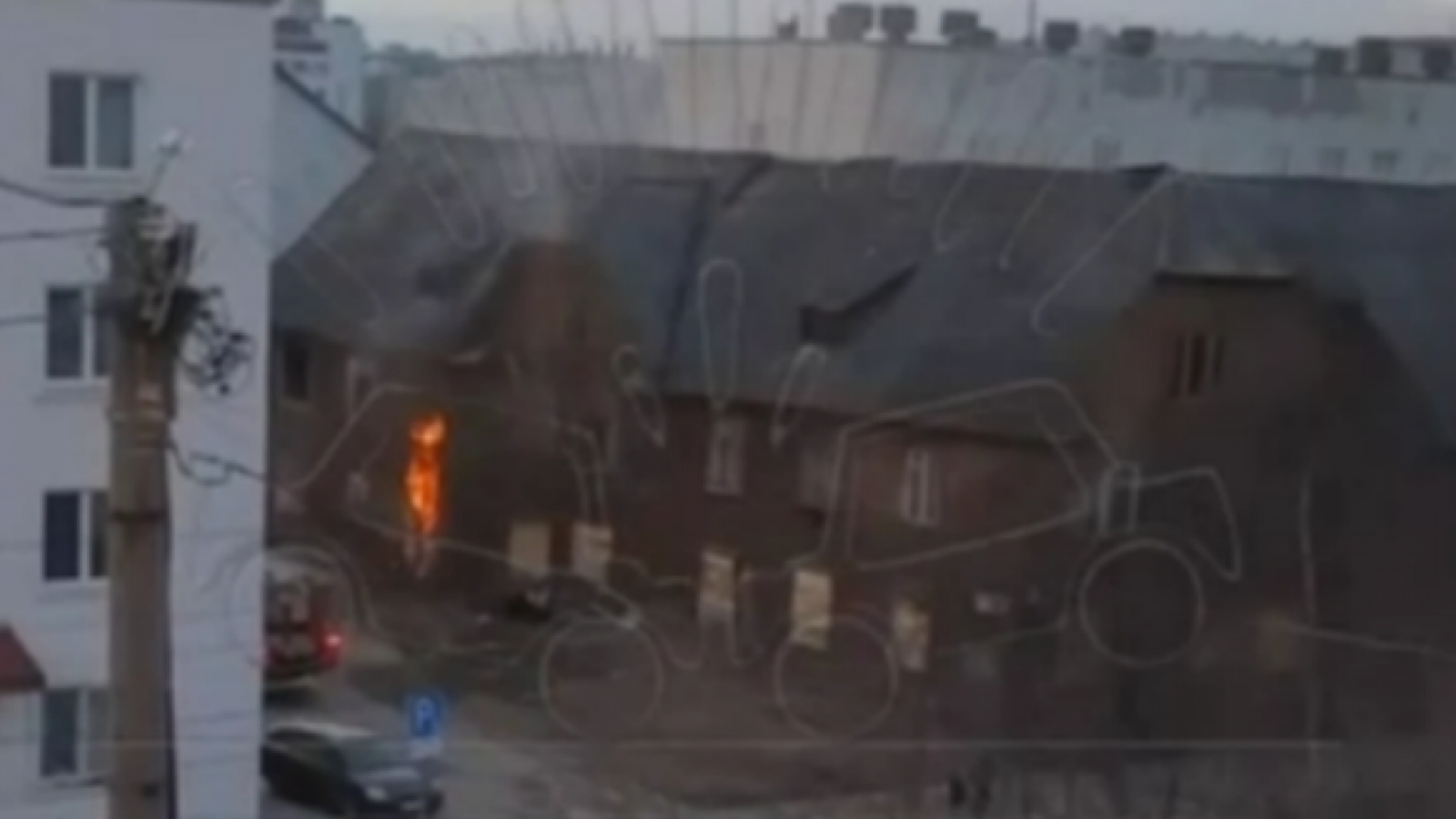 Из окна первого этажа вырывается пламя. Идёт дым. Пожарные на место возгорания ещё не прибыли.