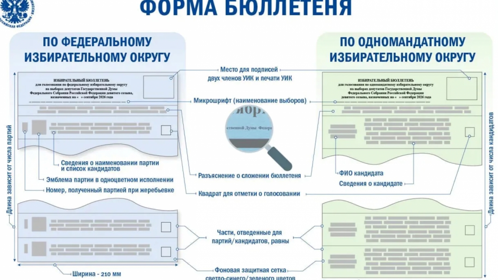 Бюллетени печатаются на бумаге белого цвета с использованием микрошрифта и фоновой защитной сетки светло-синего цвета для голосования по федеральному округу или зелёного цвета для голосования в одномандатных округах.