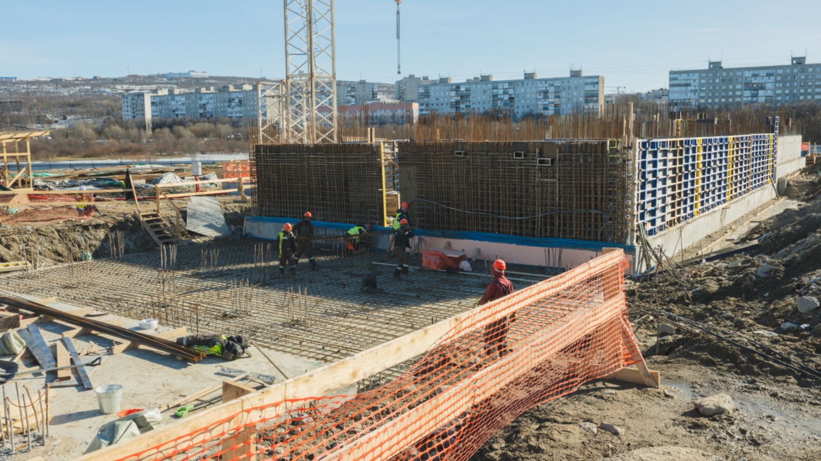 На строительной площадке активно идут работы. В третьей и четвёртой секциях возводят монолитный каркас на третьем этаже. Стены готовы на 80–90%, перекрытия — на 20%. В первой, второй и пятой секциях устанавливают стены подвала.