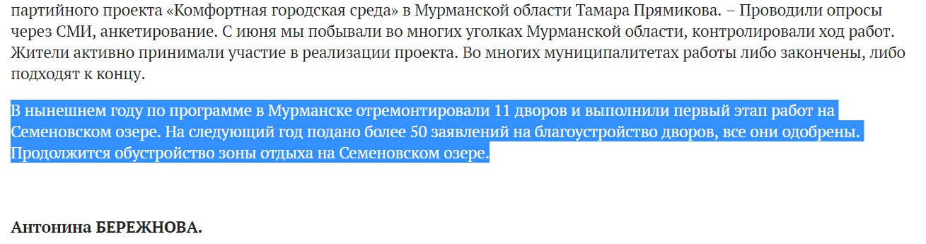 С её слов «Вечерний Мурманск» в статье с заголовком «Красоты создают по графику» утверждает, что «в нынешнем году по программе в Мурманске отремонтировали 11 дворов». Отремонтировали!