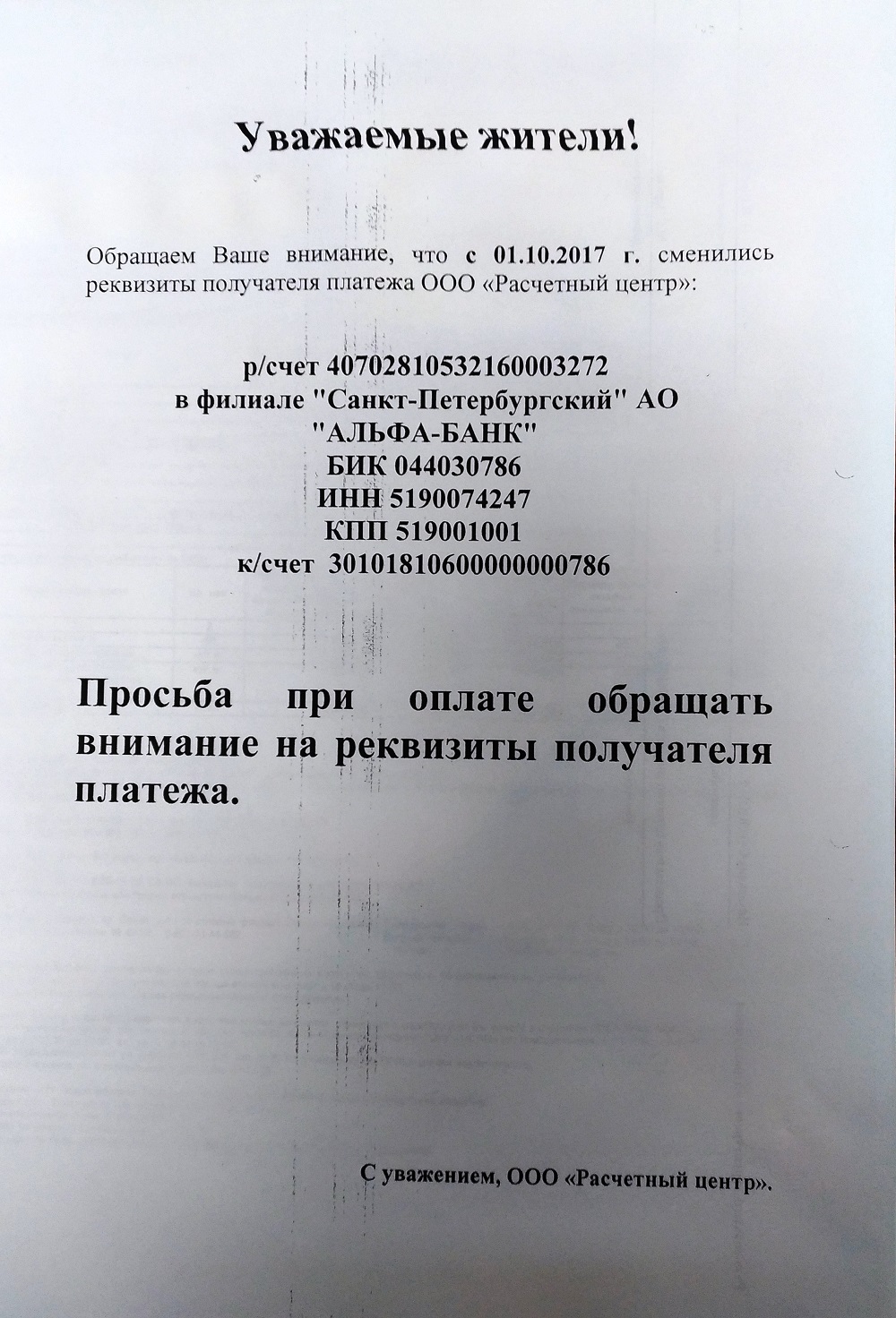 Но очевидные факты не признавать невозможно: на прошлой неделе в Мурманске был зарегистрирован новый расчётный центр. И в домах ООО «ЖЭК» появились соответствующие объявления. Выводы очевидны: теперь все платежи «побегут» через него, а старый и пустой отдадут на растерзание приставам.