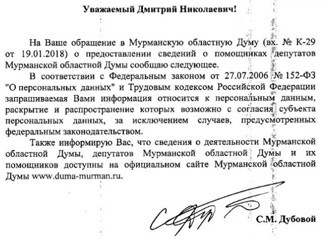 На запрос мурманского блогера Качалова из Думы пришёл ответ за подписью спикера Сергея Дубового. В нём отказано в предоставлении сведений о помощниках депутатов.