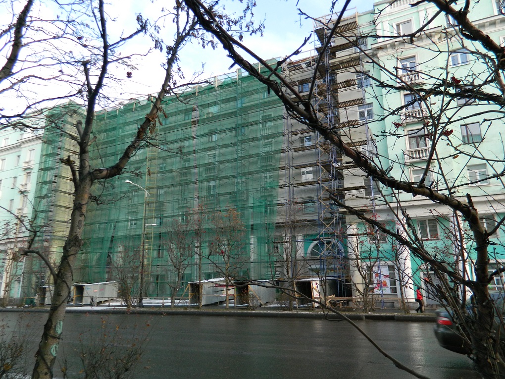 Начнём с центра города. Дом №80 на проспекте Ленина фасадом выходит на площадь Пять Углов, в самое «сердце» Мурманска. Сегодня здание закутано в леса и оштукатурено, но не до конца. Идёт снег, а рабочие только заканчивают подготовку стен к покраске.