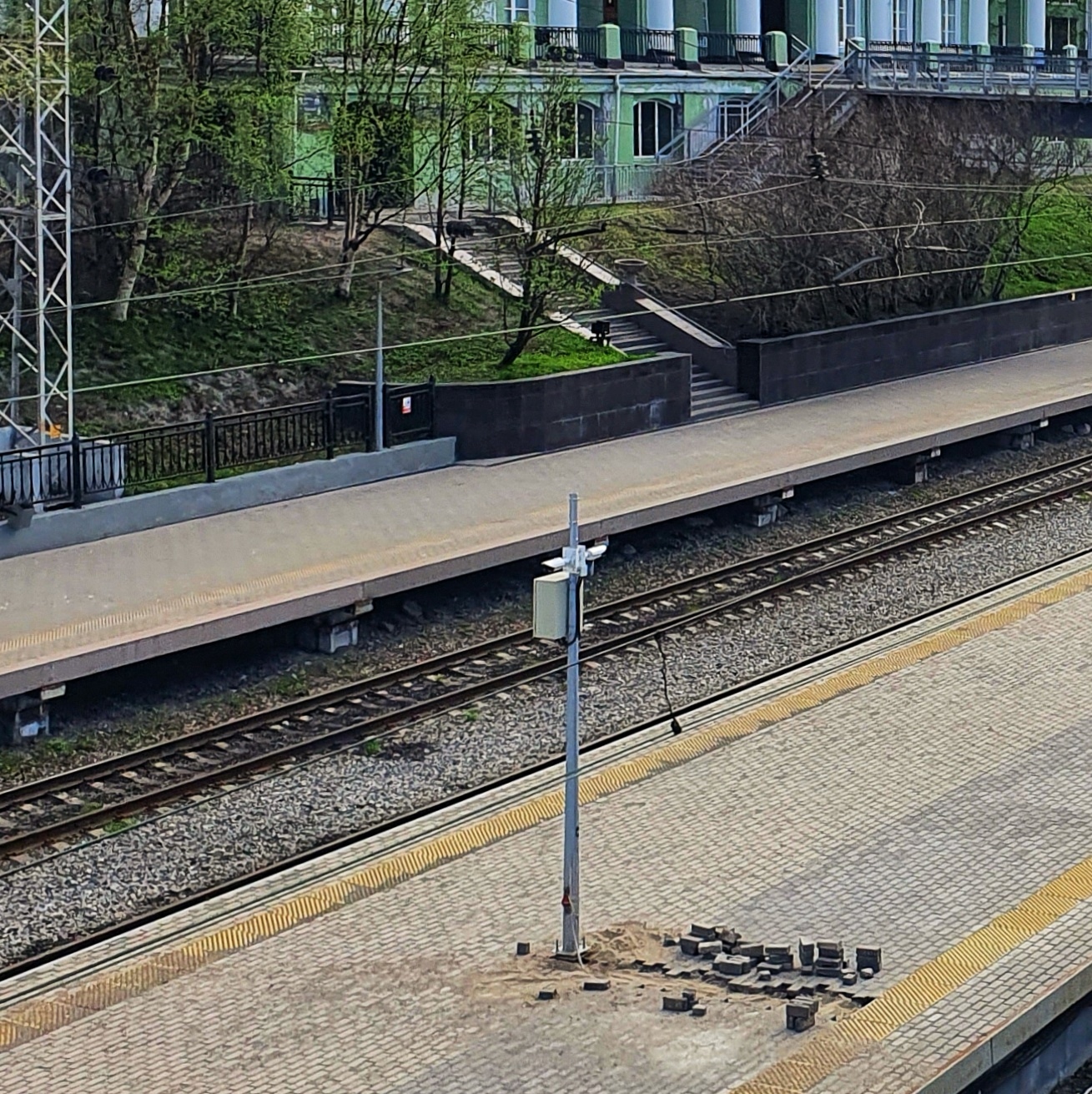 На платформах и пешеходных мостах велись строительные работы, но их не закончили. На перроне лежат вывороченные при монтаже камер видеонаблюдения куски брусчатки. И рядом нет ни одного человека. Все это хорошо видно на снимках.